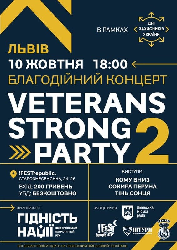 Зустрічайте: Дні захисників України 2020. Цього разу у Львові. Почнемо 10-го жовтня з потужної Veterans strong party 2 LVIV. Де на одній сцені, вперше в історії, виступатимуть Сокира Перуна, Тінь Сонця / Tin' Sontsya та КОМУ ВНИЗ .