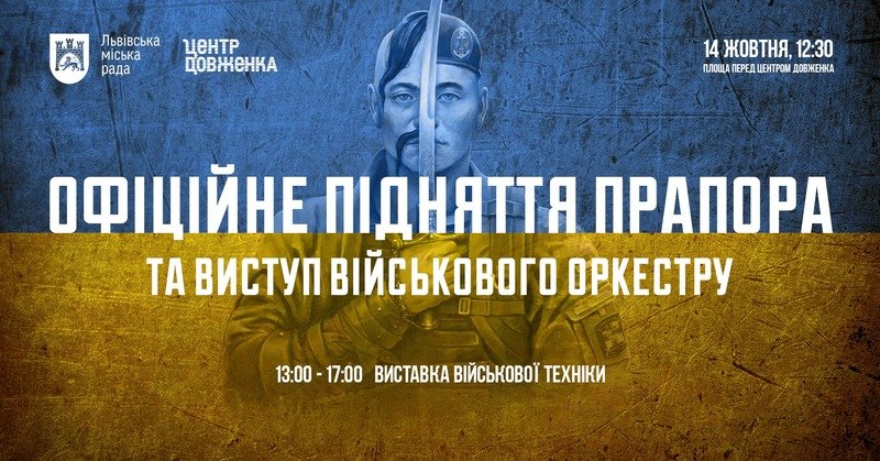о 12:30 на площі Центру Довженка відбудеться урочисте підняття прапора, спільна молитва та виступ військового оркестру.