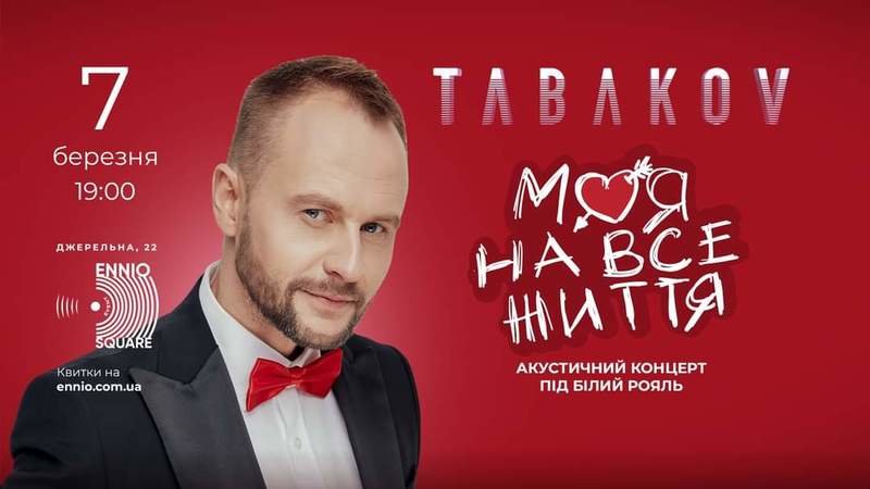 У неділю, 7 березня, у Львові, на сцені Ennio Event Square (вул. Джерельна, 22), відбудеться сольний концерт Павла Табакова, який віднедавна виступає як Tabakov. Концертна програма під назвою «Моя на все життя» звучатиме у супроводі білого рояля, що додасть початку весни особливих шарму та романтики. Початок – о 19:00. Концерт відбудеться із дотриманням вимог МОЗ.