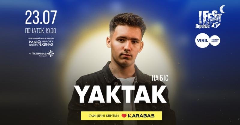 “Пісні YAKTAK влучно поєднуються з життєвими переживаннями кожного з нас! Адже він співає мовою душі, тож у нього є що Вам сказати. Чудовою нагодою стане нова сольна програма 23 липня. Побачимось у !FESTrepublic”, – запрошують на концерт організатори VINIL Concert agency.