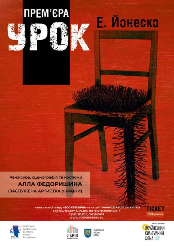 П’єса «Урок» Е.Йонеско входить до авангарду французької і світової драматургії. Це пробуджує творчу уяву. Вистава зроблена в жанрі комедійної рок драми. Комедійно-сатирично висміюється автократія і агресія у будь-якому вигляді. Яскравий бурлеск акторської гри, рок-гурт і візуальне рішення не залишать Вас байдужими. Народ, який сміється – непереможний!