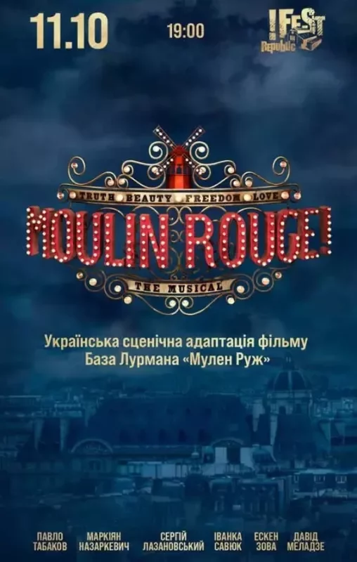 Театр Мюзиклу представляє нову сценічну адаптацію однойменного фільму База Лурмана Moulin Rouge! За бокалом ігристого ви спостерігатимете за неймовірно пишним та захопливим видовищем. На сцені: