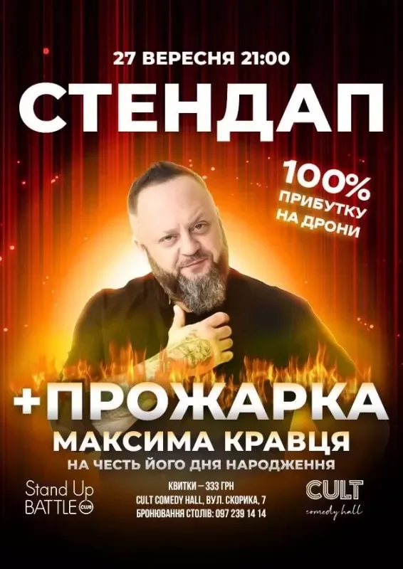 Батько Cult Comedy Hall та найстарший стендап-комік Львова святкує свій день народження! Вас чекає найкращий матеріал, нові жарти та історії від іменинника, а також – ПРОЖАРКА Максима Кравця від коміків! Хто саме виступатиме на прожарці залишається в таємниці до початку події, навіть для Максима.