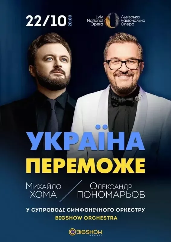 Нова програма Олександра Пономарьова та Михайла Хоми «Україна переможе» у супроводі симфонічного оркестру BIGSHOW ORCHESTRA подарує нове звучання перевірених часом хітів.