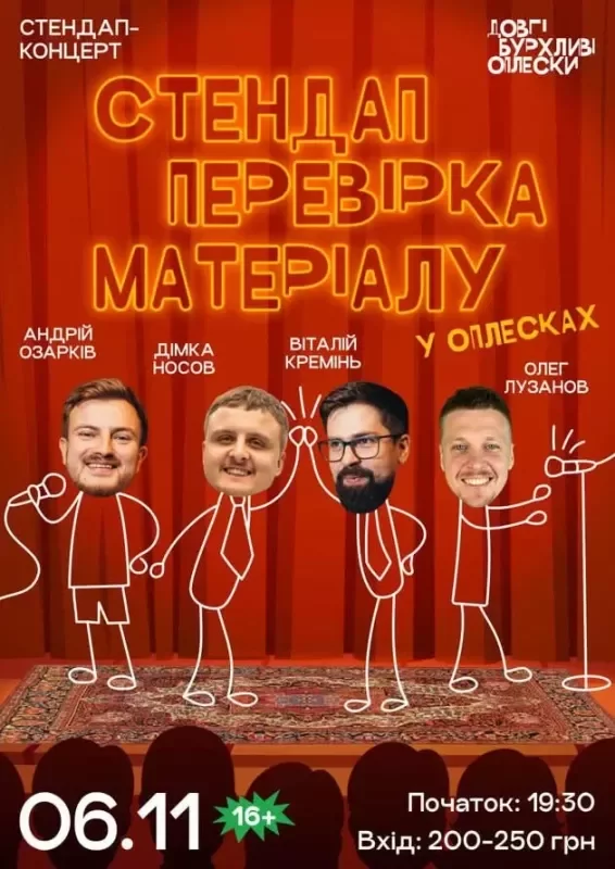 Запрошуємо на перевірку матеріалу, де коміки виступатимуть зі своїми новими жартами, докручують старі та смішать вас. Спокійний стендап вечір у хорошій компанії.
