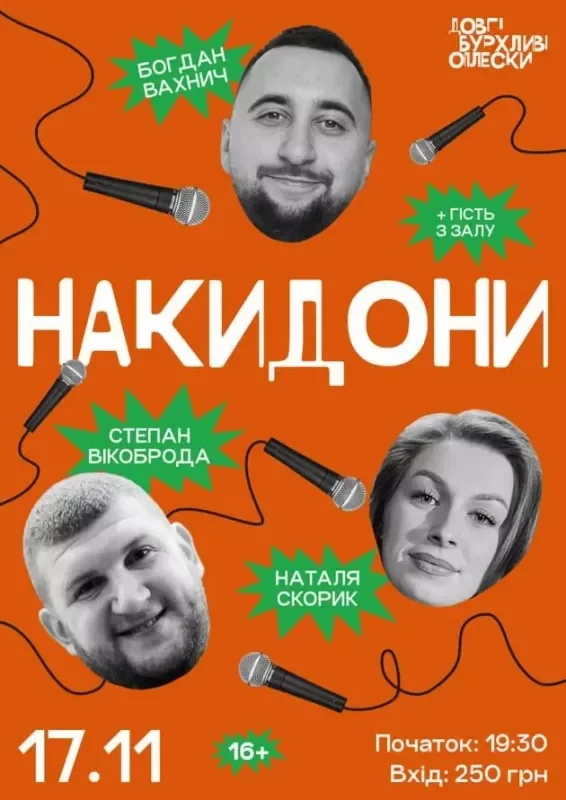 Шоу "Накидони" - імпровізаційний формат, в якому коміки знайомляться з глядачами, обговорюють новини і роблять свої заготовки смішнішими! Глядачі можуть пропонувати свої новини і весело проводити вечір в теплій атмосфері!