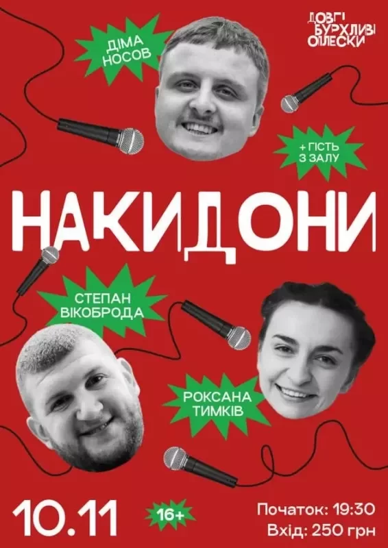 Шоу "Накидони" - імпровізаційний формат, в якому коміки знайомляться з глядачами, обговорюють новини і роблять свої заготовки смішнішими! Глядачі можуть пропонувати свої новини і весело проводити вечір в теплій атмосфері!