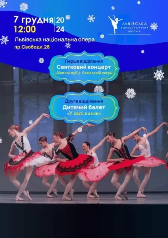 Запрошуємо вас відвідати подію, де мрії оживають у танці юних артистів. Львівська хореографічна школа, що має багаторічну традицію підготовки талановитих артистів балету, подарує вам неповторну атмосферу зимових свят. Учні школи постійно дивують публіку своєю майстерністю, емоційністю та відданістю мистецтву танцю.
