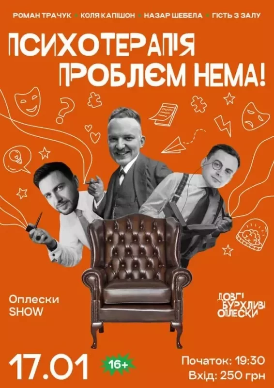 На сцені: професійні коміки Назар Шебела і Коля Капішон та професійний гештальт-терапевт Роман Трачук.