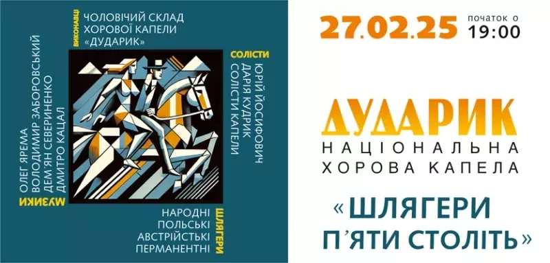 «Гей, соколи», «Карії очі, чорнії брови», «Кава мушє биць», «Намалюй мені ніч», «Червона рута» і багато інших пісень українці люблять і співають ось вже 5 століть. 20 шлягерів, «хітів» та перлин увійшли у цю концертну програму, кожна пісня на вагу золота. Чоловічий склад капели «Дударик» у супроводі шлягер-оркестри, у співпраці із неймовірними солістками Дарією Кудрик та Софією Лешишак, подарують львівʼянам та гостям міста музичний вечір чудових вражень.
