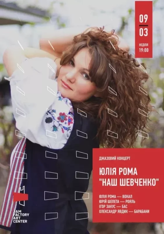 Юлія Рома — українська джазова співачка, композиторка та педагогиня, авторка трьох сольних альбомів. Її творчість поєднує поезію Тараса Шевченка з енергією джазової імпровізації. Юлія виступала з провідними українськими джазовими музикантами та брала участь у численних музичних проєктах і телевізійних передачах.Разом із Юлією на сцені: