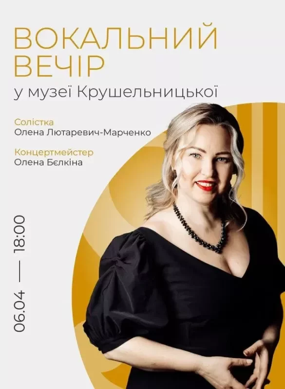 Запрошуємо на вокальний вечір у виконанні черкаської оперної співачки Олени Лютаревич-Марченко до салону Соломії Крушельницької.