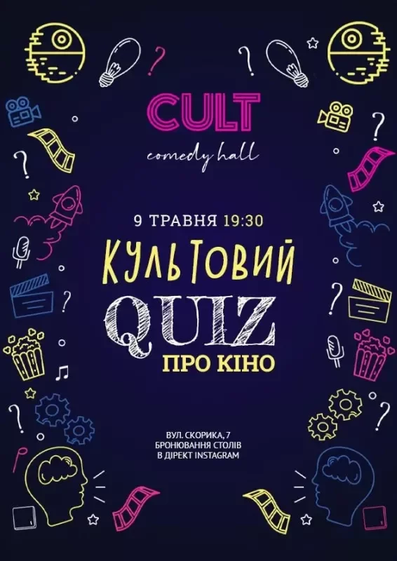 Вже вдруге організовуємо для вас Культовий квіз! Цього разу квіз про кіно — вечір для тих, хто любить фільми й хоче весело провести час у компанії друзів. На вас чекають: