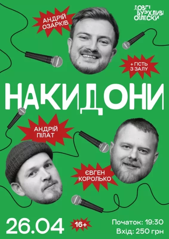 Шоу "Накидони" - імпровізаційний формат, в якому коміки знайомляться з глядачами, обговорюють новини і роблять свої заготовки смішнішими! Глядачі можуть пропонувати свої новини і весело проводити вечір в теплій атмосфері!