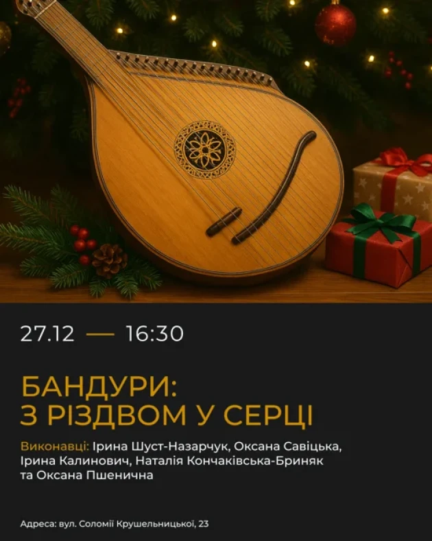 Різдво — це час світла, тихої радості й глибоких традицій. Особливе звучання цього свята народжується у тембрі бандури — ніжному, чистому й водночас урочистому. Саме таку атмосферу створить у Музеї Соломії Крушельницької квінтет бандуристів "Калинове намисто" у складі Ірини Шуст-Назарчук, Оксани Савіцької, Ірини Калинович, Наталії Кончаківської-Бриняк та Оксани Пшеничної. Музикантки представлять різдвяну програму, що поєднує традиційні колядки, сучасні духовні пісні та улюблену святкову класику.