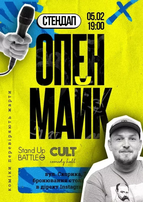 Це вечір, де коміки виходять на сцену зі своїми жартами та тестують матеріал. Він отримує перші реакції залу й формується для майбутніх виступів. На ОПЕНМАЙК може вийти кожен охочий - спробувати себе на сцені та показати свій стендап.