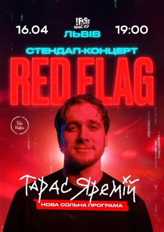 Red Flag – це маркер будь-яких стосунків. Бачиш один – це привід замислитися. Бачиш два чи три – біжи не обертаючись. Відомий стендап-гуморист Тарас Яремій пропонує вашій увазі програму, яка присвячена стосункам та редфлегам кожного з нас. Це чудовий шанс посміятися над стосунками, які мали закінчитися вже після першого побачення.