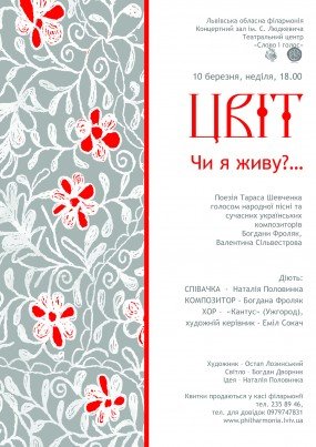 Пролунає поезія Тараса Шевченка голосом народної пісні у виконанні лауреата Національної премії України імені Тараса Шевченка Наталії Половинки та музика сучасних українських композиторів Богдани Фроляк і Валентина Сильвестрова у вечорі поезії «Цвіт – Чи я живу?...».