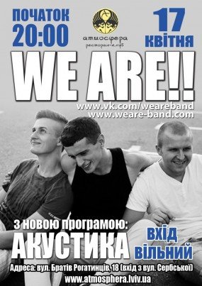 We Are!! – это наш родной украинский коллектив, музыка которых восхищает не только украинскую аудиторию, но даже «избалованных» британских слушателей и любителей брит-рока!…