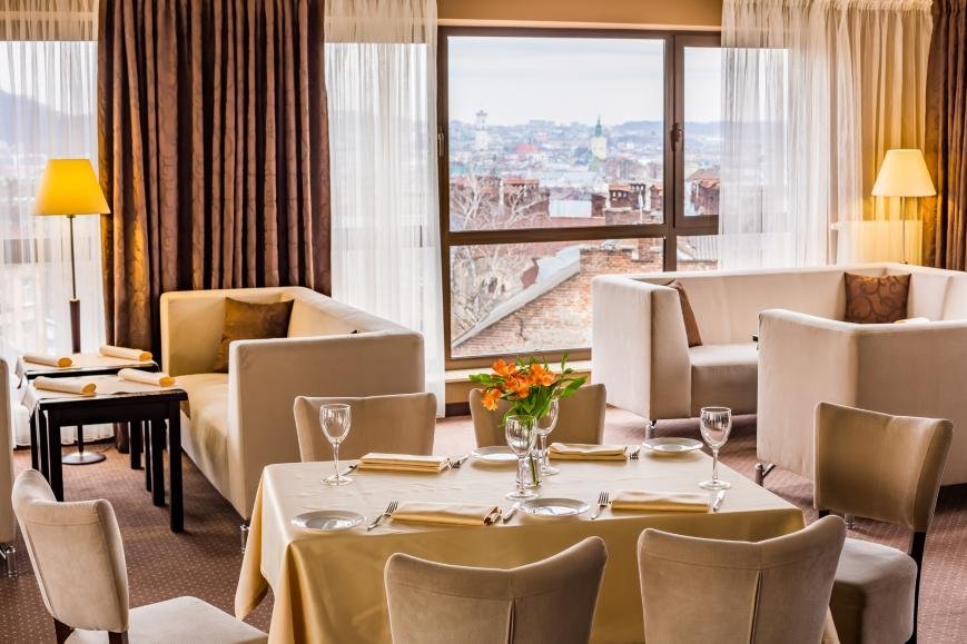 Також ви можете посмакувати стравами ресторану у Панорама Лаундж Барі та Кафе готелю "Таурус"