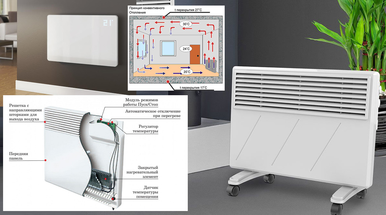 Достаточно популярной альтернативой для обогрева жилых помещений являются электрические конвекторы. Это довольно простое устройство, принцип работы которого состоит в транспортировке холодного воздуха, его последующем нагреве и выходе в пространство уже теплого, заданной пользователем температуры. Основное преимущество – быстрый, но при этом плавный прогрев воздуха.