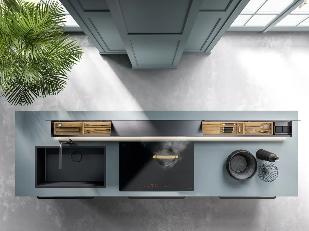 Monolith — це витяжка, яка розміщується не на стіні й не над варильною поверхнею, а в самій стільниці. Усередині прихована система аспірації та відсіки для зберігання ножів, дощок, спецій. Також доступне підсвічування та розетки.