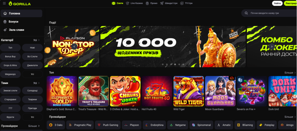 Українське онлайн казино за гроші Gorilla подбало про те, щоб інтерфейс був інтуїтивно зрозумілим і доступним навіть для новачків. Сайт працює стабільно, пропонує швидкий пошук популярних ігор та фільтри за провайдерами.