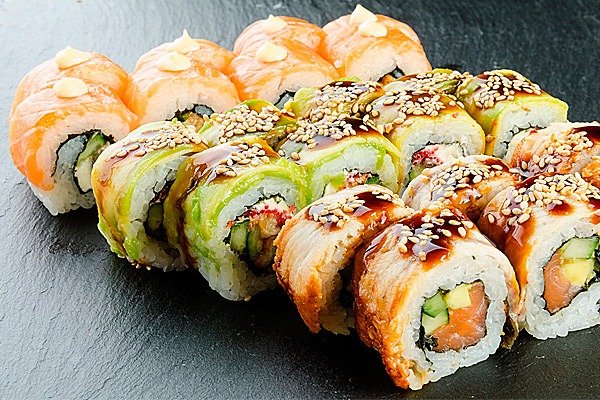 - Дракон-рол - ефектна подача, авокадо зверху, виглядає красиво на фото.