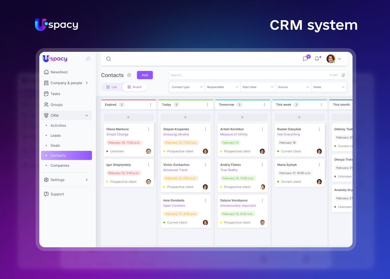 Uspacy забезпечує безболісну міграцію завдяки інструментам імпорту бази контактів, компаній та угод через Excel або CSV. При цьому система дозволяє зберегти всі напрацьовані зв’язки та історію взаємодій. Інтерфейс платформи нагадує звичні соцмережі, тому команда адаптується до нового робочого простору за лічені дні без зупинки основних процесів.