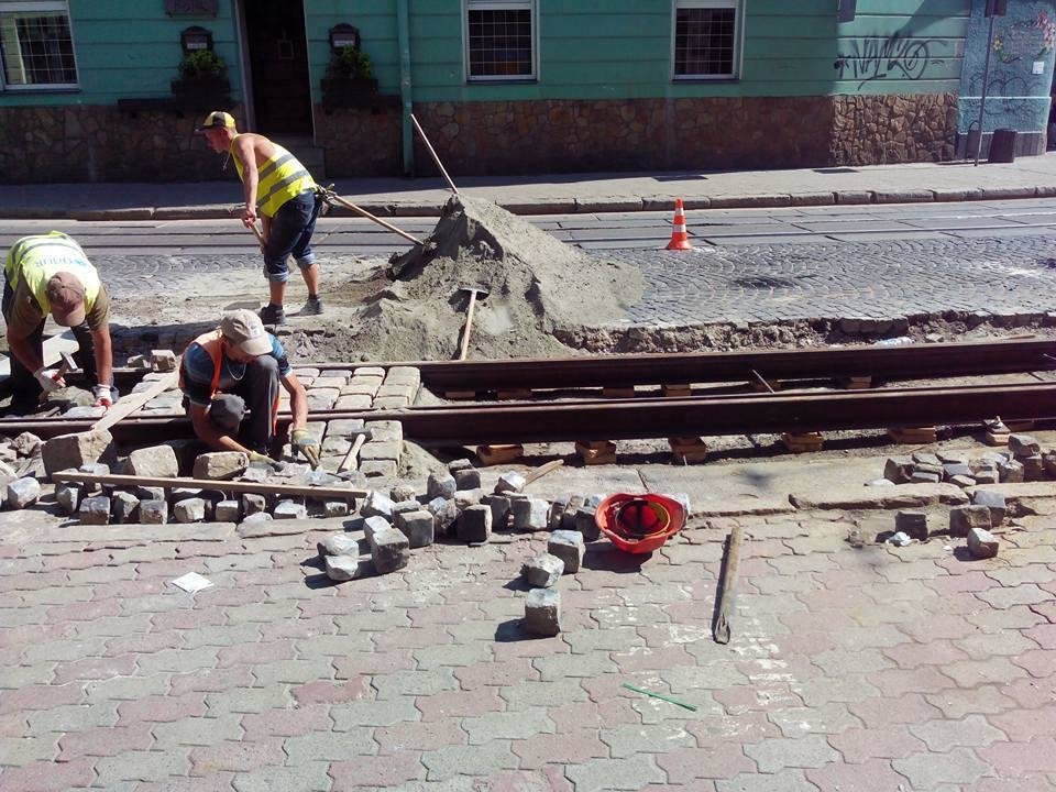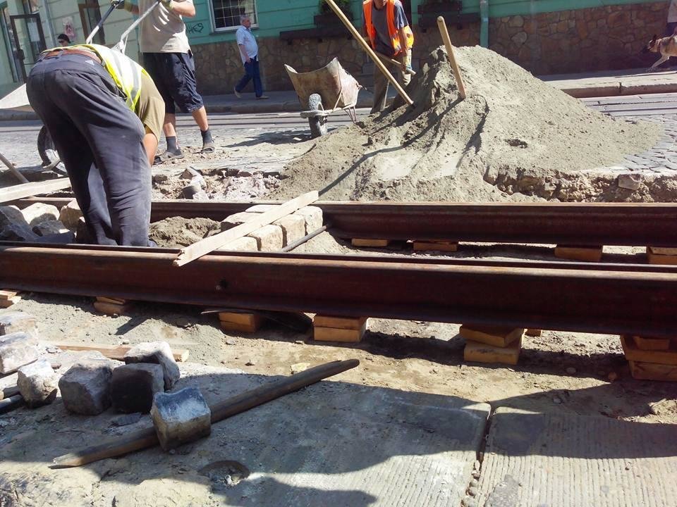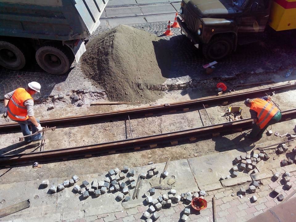 За інформацією депутата, у рамках ремонту, виконавці вкладають трамвайні рейки на дерев’яні бруски, засипають їх сухою пісочно-цементною сумішшю та замощують бруківку.
