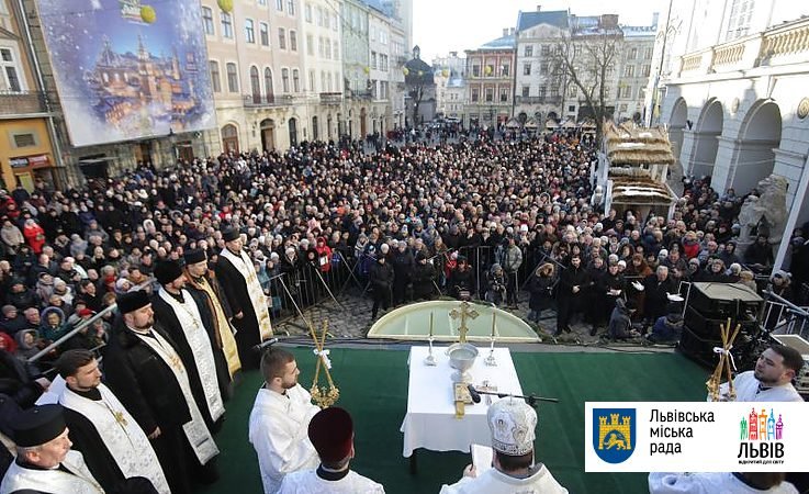 Вітання колядками на площі Ринок від львівського хору «Жайвір» та вокального октету «Орфей» розпочалось о 13:00. А о 13:30 відбувся загальноміський екуменічний молебень та освячення води за участі духовенства усіх християнських конфесій міста.