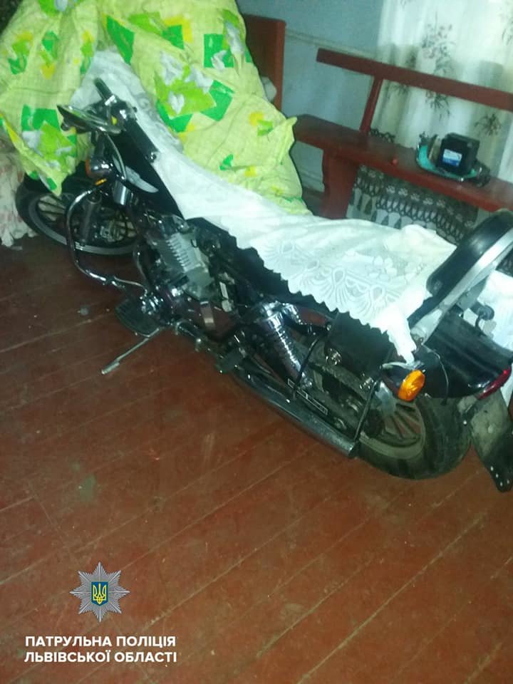 Патрульні виявили викрадений «Geon Invader» накритим в одному з будинків у селі Золочівського району. Згодом 23-річний мешканець Львова зізнався, що викрав цей мотоцикл разом із поплічником. На місце події викликали слідчих Золочівського відділу поліції.