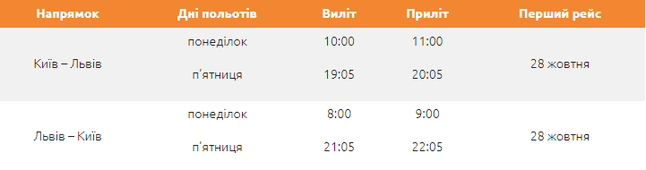 Авіарейси зі Львова до Києва виконуватимуть двічі на тиждень – щопонеділка та щоп’ятниці. Політ триватиме годину.