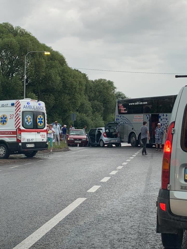 На автодорозі не розминулися міжнародний рейсовий автобус, яким керував 32-річний мешканець Золочева, авто «Хундай», за кермом якого перебував 31-річний житель Хмельницького, і «Опель Вектра». Останнім керував 28-річний місцевий мешканець.