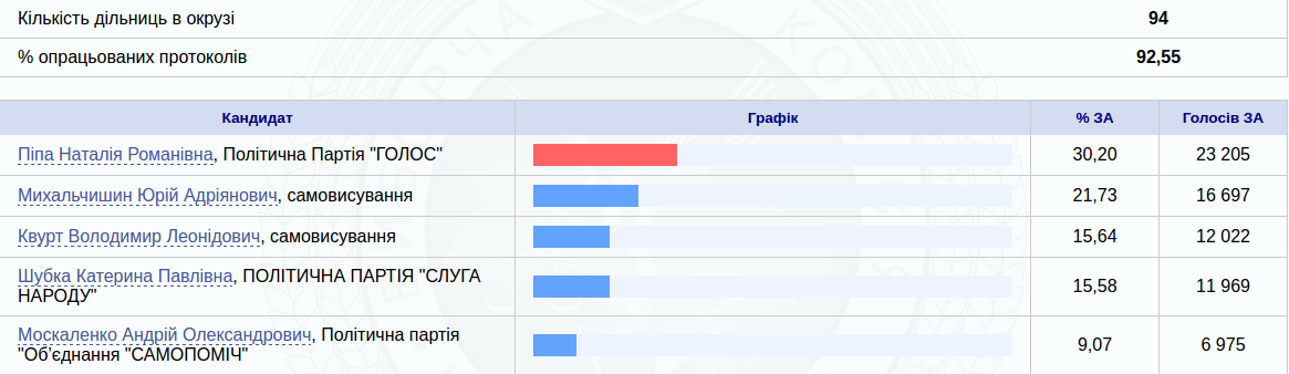 За даними ЦВК, у виборчій “гонці” лідирує кандидатка від політичної партії “Голос” Наталія Піпа, яка набрала30,20% голосів. Другим в рейтингу опинивсясамовисуванецьЮрій Михальчишин - 21,73%, а за нимсамовисуванецьВолодимир Квурт — 15,64%.