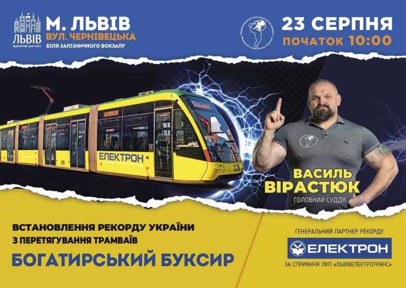 Сьогодні, 23 серпня, о 10:00 ранку у Львові на вулиці Чернівецькій (навпроти залізничного вокзалу) встановлюватимуть новий рекорд України з перетягування трамваїв Концерну «Електрон».