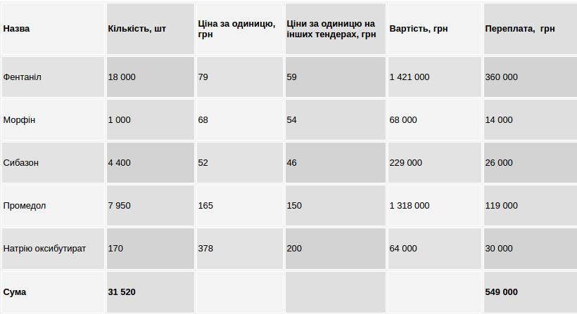 Цікаво, що ці п’ять наркотичних препаратів придбані за вищими цінами, ніж в інших аналогічних закупівлях у Львівській області. Якщо “фентаніл” практично усі медичні заклади купували по 59 грн за ампулу, то Львівська обласна клінічна лікарня — по 79 грн за ампулу. Відтак, лише за “фентаніл”, якого придбали 18 тис ампул, переплатили 360 тис грн.