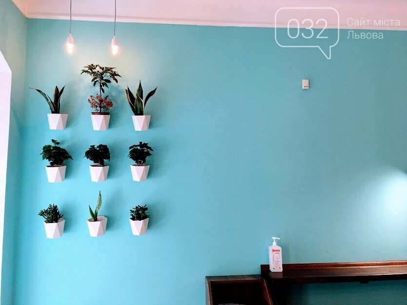 Сьогодні інтер'єр закладу прикрашають рослини в горщиках та декілька картин. Незабаром тут з'явиться ще більше рослин для того, щоб прикрасити стіни. Самі стіни тут блакитного кольору, а столи та столики - коричневого.