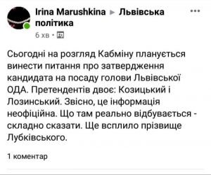 Олександр Дубінський, заступник голови комітету Верховної Ради України з питань фінансів, податкової та митної політики, на своїй Facebook сторінці написав про ще одного ймовірного кандидата - Маркіяна Лубківсього.