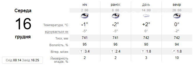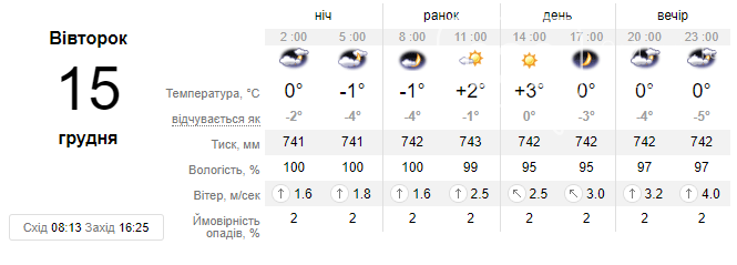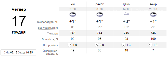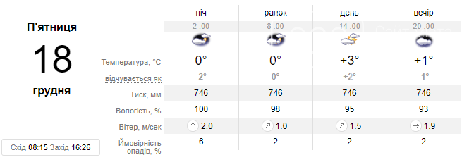 Згідно з інформацією Українського гідрометеорологічного центру, 14 грудня в Україні, крім південно-східної частини, ожеледь, на дорогах ожеледиця; вночі та вранці туман, видимість 200-500 м ( I рівень небезпечності жовтий).