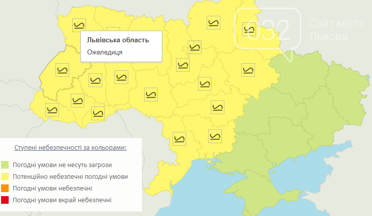 Також, згідно з інформацією Українського гідрометеорологічного центру, 2 лютого на дорогах України, крім південно-східної частини, ожеледиця (І рівень небезпечності, жовтий).