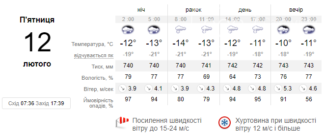 Також, згідно з інформацією Українського гідрометеорологічного центру, 11-12 лютого у зв'язку з переміщенням активного циклону в Україні очікуються складні погодні умови: