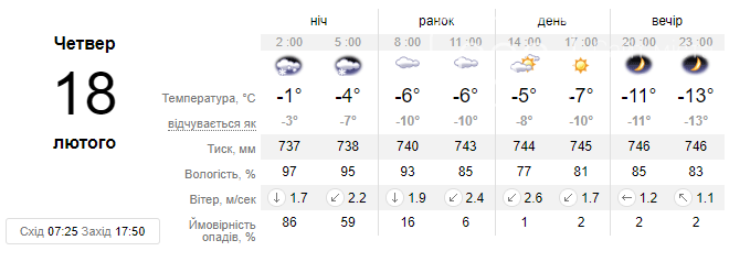 Температура вранці очікується -6 °С. Вітер помірний, з поривами не ібльше 3 м/с. Вдень прояснення на небі та невелике потепління до -5 °С, але недовго. Ввечері очікується спад до 11-13 °С з мінусом. Опадів не передбачається.