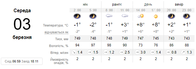 Похмура погода вранці зміниться на сонячну вдень. Температура очікується максимум до +8 °С. Ввечері спад до +2 °С. Вітер помірний, західного напрямку, протягом дня від 1 до 3 м/с. Опадів не передбачається.