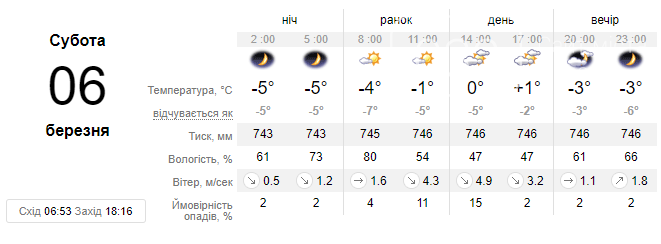 Ранок почнеться з температури -4 °С та посиленого вітру, з поривами до 5 м/с. Незважаючи на сонячну активність, цього буде замало для того, щоб зігрітися. Вдень очікується незначне потепління до +1 °С, але хмарність буде домінувати. Протягом дня зберігатиметься ожеледиця на дорогах, яка буде псувати враження від погоди. Опадів не передбачається.