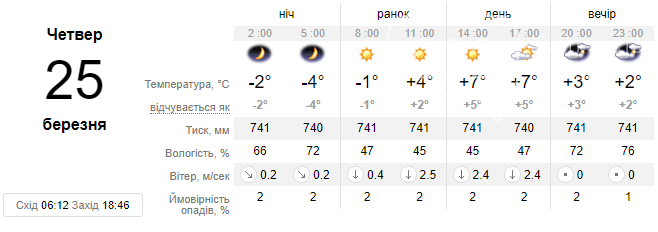 Вранці буде сонячно та чисто на небі. Помірний вітер та відносно комфортна температура до +4 °С. Ввечері очікується мінлива хмарність, але нічого серйозного, навіть прогнозують штиль.