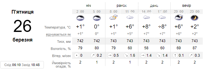 Температура максимум до +8 °С, вітер помірний, без посилень, пориви лише до 2 м/с. Попри хмарність та туман, опадів не прогнозується.
