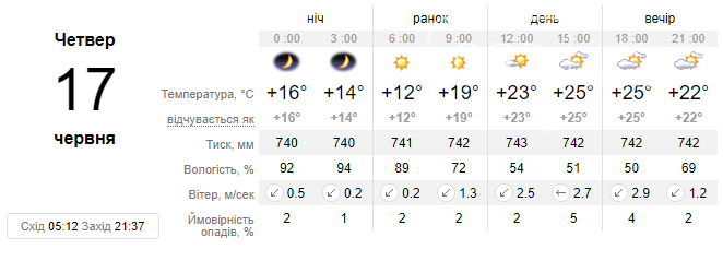 Вранці 17 червня погода у Львові буде сонячною та теплою. Протягом доби львів'ян очікує помірний вітер та приємний показник температури. Опадів не передбачається, день пройде спокійно.