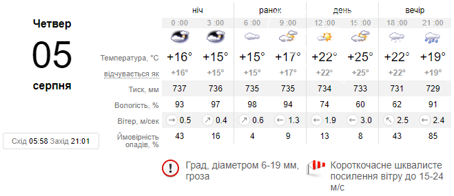 Згідно з інформацією Українського гідрометеорологічного центру, 5-6 серпня у західних, північних, більшості центральних, Одеській та Миколаївській областях грози, вдень місцями град та шквали 15-24 м/с (І рівень небезпечності, жовтий);