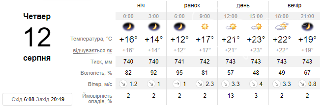 Згідно з інформацією Українського гідрометеорологічного центру, 12 серпня у південно-східній частині України грози, подекуди шквали 15-20 м/с (І рівень небезпечності, жовтий).